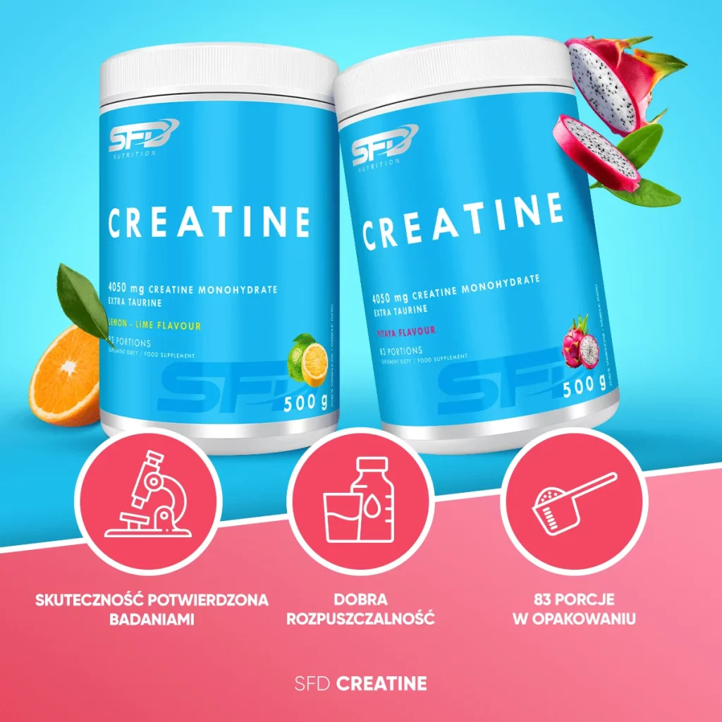 Kreatyna w wersji smakowej od SFD Nutrition zawiera identyczną ilość monohydratu jak inne wersje tej marki – 4050 mg w porcji, z czego 3565 mg to czysta kreatyna. Dodatek tauryny (450 mg) może stanowić wartość dodaną dla osób intensywnie trenujących. Suplement rozpuszcza się w wodzie i występuje w różnych smakach, co zwiększa komfort stosowania. Prosty skład i obecność znanej formy kreatyny sprawiają, że produkt sprawdzi się jako podstawowy wybór przy długoterminowej suplementacji. Obecność substancji pomocniczych, takich jak regulator kwasowości czy słodzik, wpływa na smak, nie zmieniając wartości funkcjonalnej.